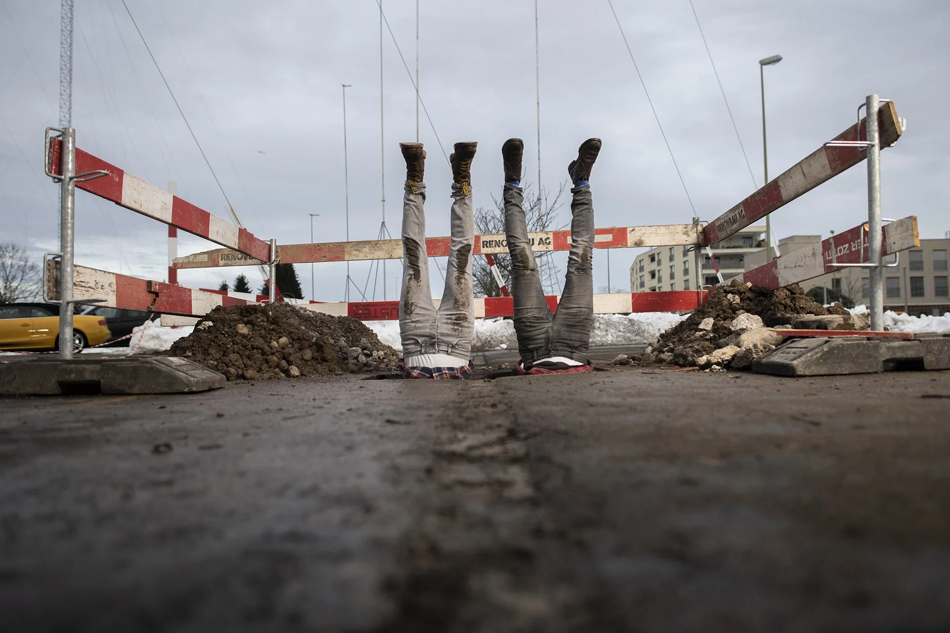 Zwei Menschen mit umgedrehter Kleidung, die in einem Baustellenbereich mit Erdhaufen und Absperrbaken eingemauert sind, während die Füße nach oben schauen.