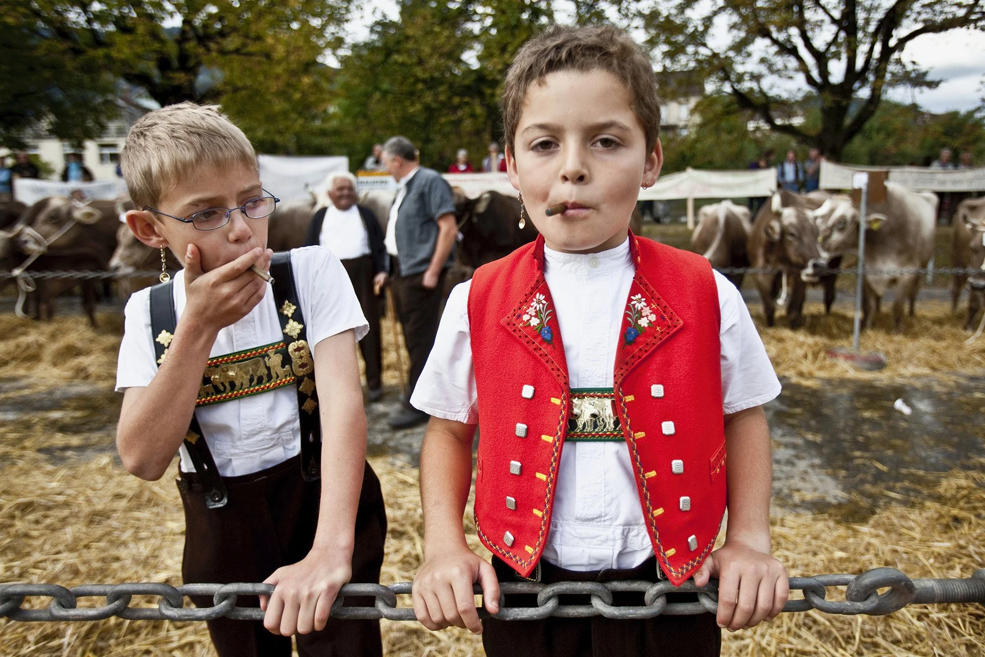 Zwei Kinder in traditioneller Tracht stehen an einem Zäunchen bei einer Viehmarktveranstaltung, im Hintergrund Kühe und andere Teilnehmer.
