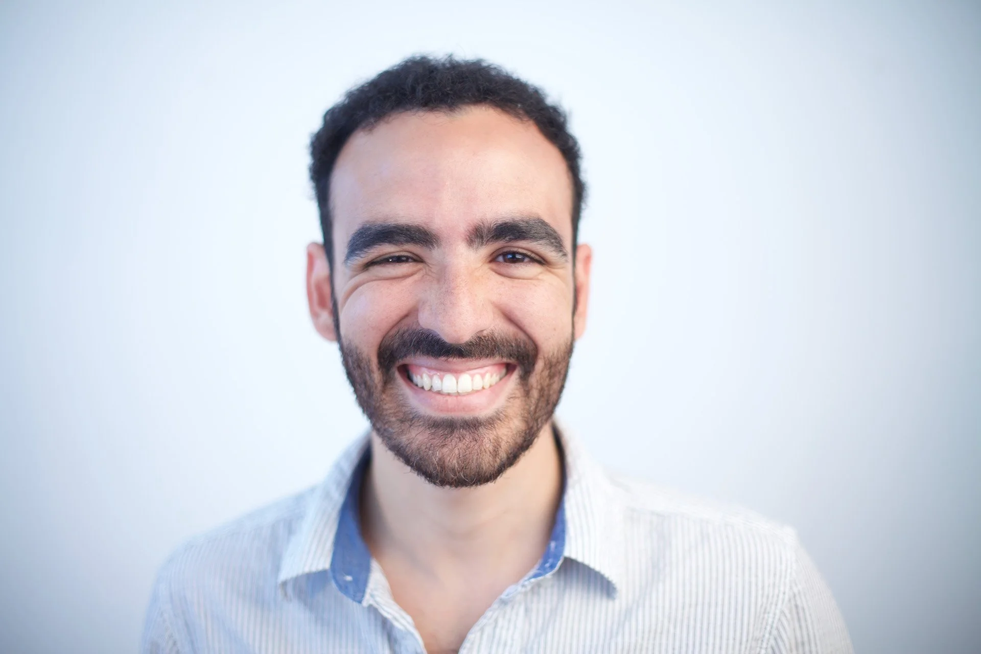 Porträt eines lachenden Mannes mit dunklem Haar, Bart und heller Kleidung vor hellem Hintergrund.